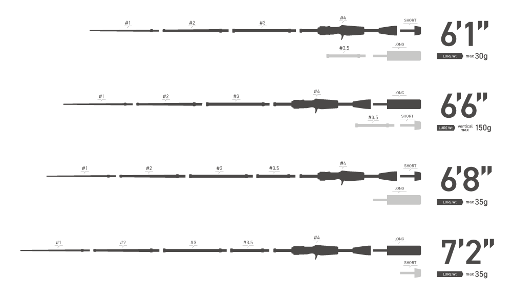 这款鱼竿能够完美适应各种垂钓场景:6英尺1英寸的竿身适合精准抛投;通过调节竿尾,即可切换至6英尺6英寸的竿身,适用于较重的铁板、深海拖钓或一般的垂直钓法;而更长的6英尺8英寸和7英尺2英寸的竿身则可用于中等重量拟饵的抛投,使得这支仅重162克的鱼竿在多种垂钓方式中都能发挥出色的功能。
